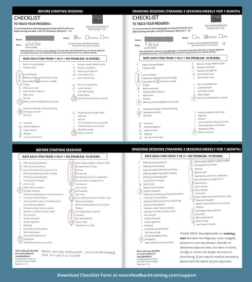 Our clients who fill them out see better results when they use the self-reporting checklist as a guidepost.  They benefit in two ways.  This practice leads to optimized and individualized training that fits our clients' needs. Rather than follow a prescribed amount, clients discover how many sessions are right for them and their children.